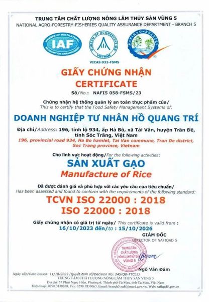 CÔNG TY TNHH NÔNG NGHIỆP & THỰC PHẨM HỮU CƠ MIQUAMIQUAFOOD là nhà phân phối Gạo Ông Cua chính Hiệu tại TPHCM. Chúng tôi đã phân phối sỉ & lẻ gạo Ông Cua từ 2015 với các dòng sản phẩm gạo ST20, ST21, ST24, ST25… Và đến năm 2019 & 2023, gạo ST25 đạt giải nhất gạo ngon nhất Thế Giới tại Manila 2019 & Cebu 2023 Philippines thì mới được người tiêu dùng biết đến nhiều và được phổ biến rộng rải trong cả nước. Hiện nay, MIQUAFOOD đã phân phối đến hơn 10 tỉnh thành trong cả nước và cung cấp gạo đến hơn 15.000 hộ gia đình tại khu vực TPHCM. Với nhu cầu gạo ngon và thị hiếu người tiêu dùng ngày càng nhiều, nên đã có nhiều đơn vị và các cửa hàng làm nhái và bán gạo ST25 nhái (hàng giả). Vì vậy, để người tiêu dùng không mua nhầm hàng giả và thiếu chất lượng, MIQUAFOOD khuyến cáo Quý khách hạn chế mua gạo trên các nền tảng thương mại điện tử hoặc các cửa hàng lạ.  Gạo Ông Cua ST25 Lúa TômGạo Ông Cua ST25 được trồng từ vùng Lúa-Tôm: Lúa được gieo trồng ở vùng nước lợ trong mùa mưa sau vụ nuôi tôm mùa khô (trồng luân canh 1 vụ lúa 1 vụ nuôi tôm). Do được nuôi dưỡng chủ yếu bởi nguồn dinh dưỡng tự nhiên còn sót lại sau khi nuôi tôm.Lúa được trồng theo quy trình sản xuất an toàn để đảm bảo điều kiện sống tốt cho con tôm trong ruộng lúa và vụ nuôi tôm kế tiếp. Gạo Ông Cua ST25 Lúa-Tôm "Gạo ngon nhất thế giới năm 2019 & 2023" được đóng túi 5kg, Một kiện hàng theo tiêu chuẩn nhà máy đóng gói có 5 sản phẩm tổng 25kg.Các sản phẩm Gạo Ông Cua được trồng từ giống gạo ST25 là các loại gạo thuộc nhóm hảo hạng trong thị trường hiện nay. Gạo hạt dài, trong, không bạc bụng. Cơm khi nấu dẻo, thơm, hương vị ngọt dẻo đặc biệt rất thu hút. Cơm vẫn dẻo thơm cả khi để nguội. Thông tin doanh nghiệp:CÔNG TY TNHH NÔNG NGHIỆP & THỰC PHẨM HỮU CƠ MIQUAĐịa chỉ: 12 Rạch Bùng Binh, Phường 9, Quận 3 TPHCMChủ doanh nghiệp: Lê Minh QuânHotline: 0937207797 & 0938201797Email: miquafood@gmail.comFanpage: www.facebook.com/MiquafoodWebsite: miquafood@gmail.com Chứng nhận đạt được: