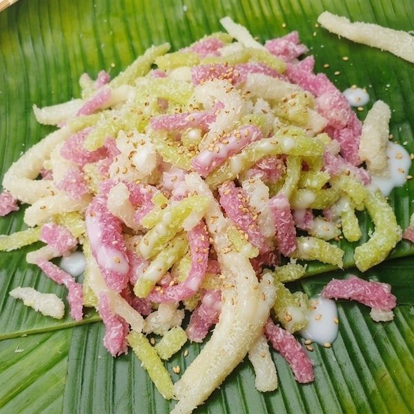 Bánh tằm mì : gọi là bánh tằm vì bánh có hình dáng thon dài và được phủ lớp vụn dừa giống con tằm, còn "mì" là từ củ khoai mì. Chính xác ẻm là tằm ngọt ta ăn mỗi chiều tan trường. Sợi bánh tằm dai dai, thơm thoang thoảng mùi khoai mì kết hợp cốt dừa sệt beo béo muối mè mẳn mẳn. Ta nói ngon tuyệt !!!