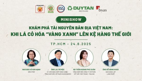 Đến với chương trình tuần này, phiên chợ xanh Tử Tế ngoài việc mang đến cho cả nhà những đơn vị chất lượng thì CN này ( 24/08) sẽ có một chương trình hết sức hấp dẫn: Chương trình sẽ được điều phối bởi cô Vũ Kim Hạnh - Giám Đốc Trung Tâm Nghiên Cứu Kinh Doanh và Hỗ Trợ Doanh Nghiệp (BSA), Chủ tịch hội Doanh Nghiệp Hàng Việt Nam Chất Lượng Cao, nhà sáng tạo nội dung: "5 phút Chuyện Thị Trường" cùng với với sự tham gia của:- Ông Lai Trí Mộc – Tổng Giám đốc Công ty Vietnam Housewares.- Bà Trần Hoàng Phú Xuân – Nhà sáng lập -  Tổng Giám đốc Công ty Cổ phần Kết nối thời trang.- Ông Đỗ Đăng Khoa – Giám đốc Green Is Gold. Với mỗi khách mời sẽ là một câu chuyện đầy hấp dẫn mà Hội Doanh Nghiệp Hàng Việt Nam Chất Lượng Cao, trung tâm BSA và BSAS cùng kết hợp với Duy Tân Recycling muốn được kể đến cả nhà về hành trình chinh phục thị trường quốc tếCỏ năn tượng – câu chuyện từ bờ ruộng tới thị trường châu ÂuCông ty Vietnam Housewares. Sợi từ lá dứa và bã cà phê – thời trang bước ra thế giớiCông ty Cổ phần Kết nối thời trang. Xơ mướp – vật liệu quen thuộc với những ứng dụng mớiCông ty TNHH Green Is Gold Với những thông tin và hoạt động phong phú như trên, Ban Tổ chức trân trọng kính mời Quý Anh/Chị cùng đến và tham dự chương trình:Mini show: Khám phá tài nguyên bản địa Việt Nam – Khi lá cỏ hóa “vàng xanh” lên kệ hàng thế giới:Thời gian: 8g00 – 11g30, Chủ Nhật, ngày 24/8/2025Địa điểm: Phiên chợ Xanh – Tử Tế, 135A Pasteur, P.Xuân Hòa (Quận 3 cũ), TP.HCMMini show là hoạt động nối tiếp Diễn đàn Chuyển đổi Xanh & Ngày hội tái chế 2025, nằm trong chuỗi Công trình Xanh và Tiêu dùng Xanh mà Chủ tịch Hội DN HVNCLC Vũ Kim Hạnh công bố tại diễn đàn. Mục tiêu là duy trì kết nối giữa doanh nghiệp, chuyên gia và người tiêu dùng, đồng thời giới thiệu các mô hình chuyển đổi tài nguyên bản địa thành sản phẩm đạt chuẩn, mở rộng thị trường tiêu thụ trong và ngoài nước. Đồng thời giới thiệu để lan tỏa, nhân rộng và khuyến khích các mô hình sáng tạo vì tương lai bền vững.